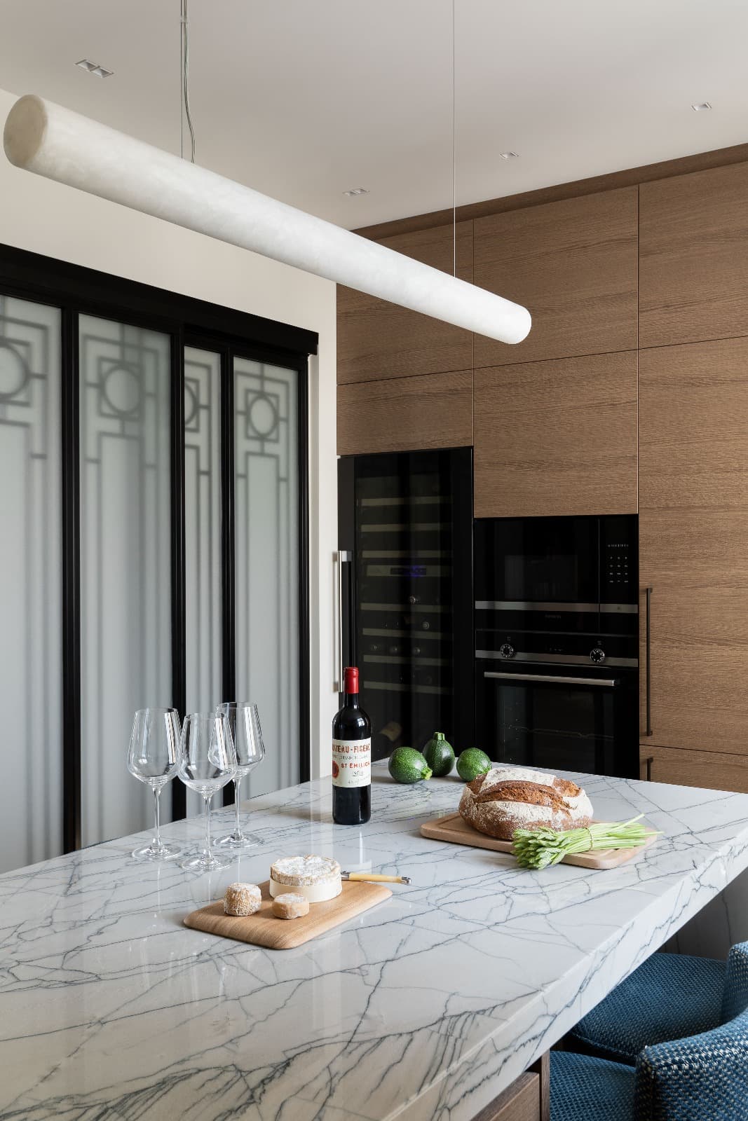 L'équilibre du projet repose aussi sur le dialogue entre les matériaux. La pierre, brute et précieuse, trouve toute sa force au contact du bois, qui vient adoucir l’ensemble par ses teintes chaleureuses et ses textures naturelles. Les verrières à montants noirs structurent les volumes avec finesse tout en laissant circuler la lumière. Cette combinaison subtile crée une ambiance à la fois contemporaine et chaleureuse, où chaque matière révèle l’autre. Une composition pensée pour durer, où l’élégance naît de l’harmonie.